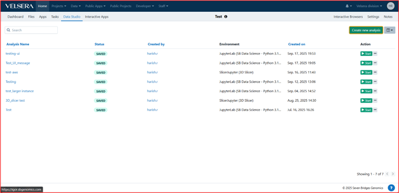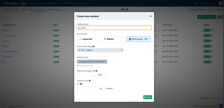 • Users must Create new analysis and select 3D Slicer(beta) as Data studio environment
